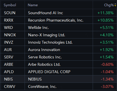 Nvidia-concept stocks mostly shined. SoundHound AI, RXRX rose 11%; WeRide rose 6%; NNOX, Innoviz rose 4%; Aurora Innovation, Serve Robotics rose 2%; CoreWeave fell 3%; APLD, Nebius fell 1%.