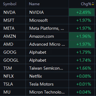 Big tech stocks rose in Wednesday trading. Nvidia up 2.5%; Amazon, Microsoft, Meta, AMD rose 2%; TSMC, Alphabet rose 1.7%.