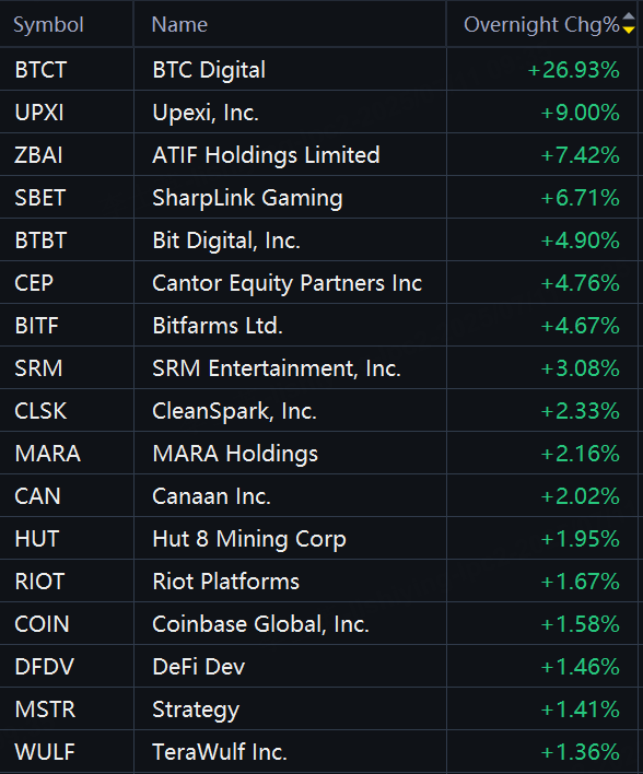 Crypto stocks gained in overnight trading. Bitcoin rallied to all-time highs on Thursday, powered by demand from institutional investors and friendly policies of U.S. President Donald Trump's administration. BTC Digital rose 27%; Upexi rose 9%; ATIF Holdings and SharpLink Gaming rose 7%; Bit Digital, Cantor Equity Partners, and Bitfarms rose 5%; SRM Entertainment rose 3%; CleanSpark, MARA Holdings, Canaan, Hut 8, Riot Platforms, and Coinbase rose 2%; Strategy rose 1%.