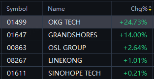 HK crypto stocks soared in morning trading. OKG Tech up 25%; Grandshores up 14%; OSL Group up 3%; Linekong Interactive up 1%.