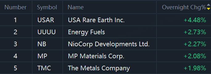 Rare earth stocks shined in overnight trading. USA Rare Earth up 4.5%; The Metals Company, Energy Fuels, NioCorp Developments Ltd., MP Materials up more than 2%.