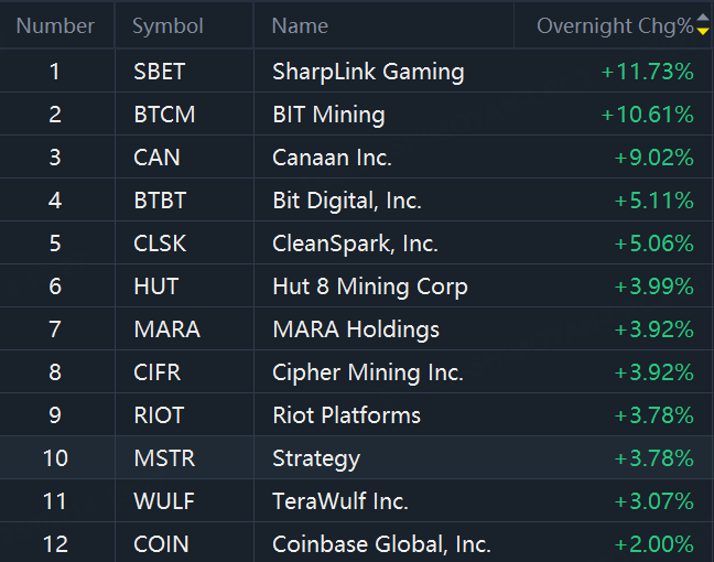 Crypto shares gained in overnight trading as Bitcoin hit a new record high at $122,000. SharpLink Gaming rose more than 11%; BIT Mining rose 10%; Canaan Inc. up 9%.