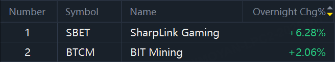 Crypto shares $SharpLink Gaming(SBET) up 6% in overnight trading after a 140% gain this month. BIT Mining up 2%.