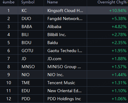 Hot Chinese ADRs jumped in overnight trading. Kingsoft Cloud up 11%; Fangdd and Alibaba up 5%; Bilibili and Baidu up 2%; JD, Nio, Tencent Music and PDD up 1%.