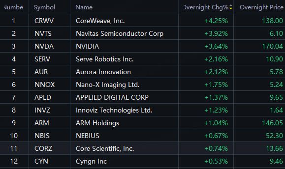 Nvidia concept stocks jumped in overnight trading. CoreWeave, Navitas and Nvidia up 4%; Serve Robotics and Aurora Innovation up 2%.