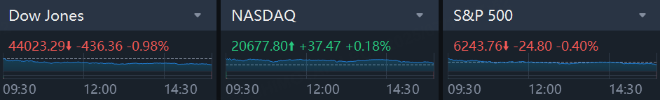 The Dow Jones Industrial Average fell 436.36 points, or 0.98%, to 44,023.29, the S&P 500 lost 24.8 points, or 0.4%, to 6,243.76 and the Nasdaq Composite rose 37.47 points, or 0.18%, to 20,677.80.