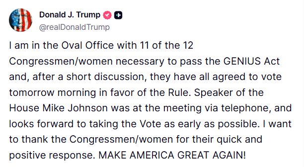 TigerJul 16, 2025 1:03 AM Trump: 11 of 12 Congress People To Pass Genius Act