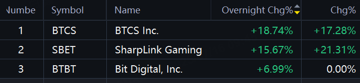 Ethereum-holding stocks shined in overnight trading. BTCS up 19%; SharpLink up 16%; Bit Digital up 7%.