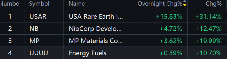 Rare Earth Stocks kept rally in overnight trading. USA Rare Earth up 16%; NioCorp Developments up 4.7%; MP Materials up 3.6%.