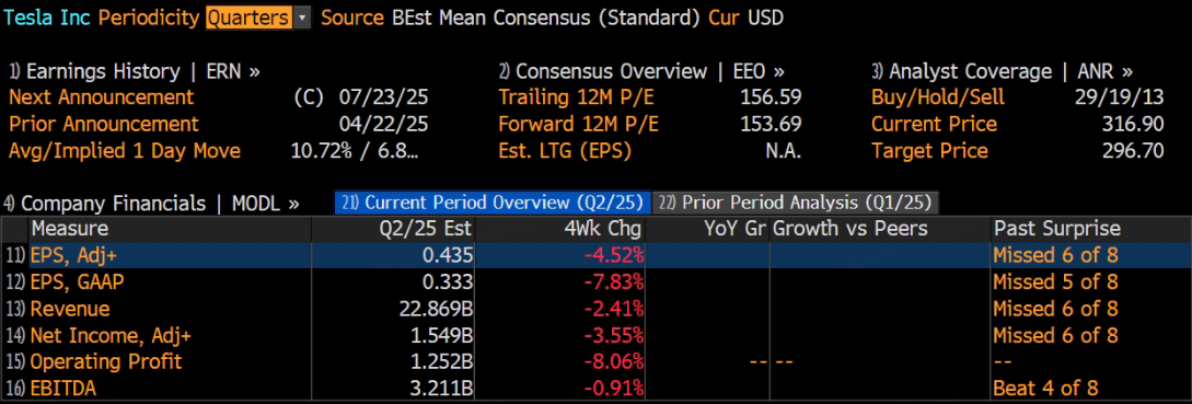 Tesla's Q2 revenue is expected to be $22.869 billion, adjusted net income will be $1.549 billion, and adjusted EPS will be $0.435, according to Bloomberg's consistent expectations.