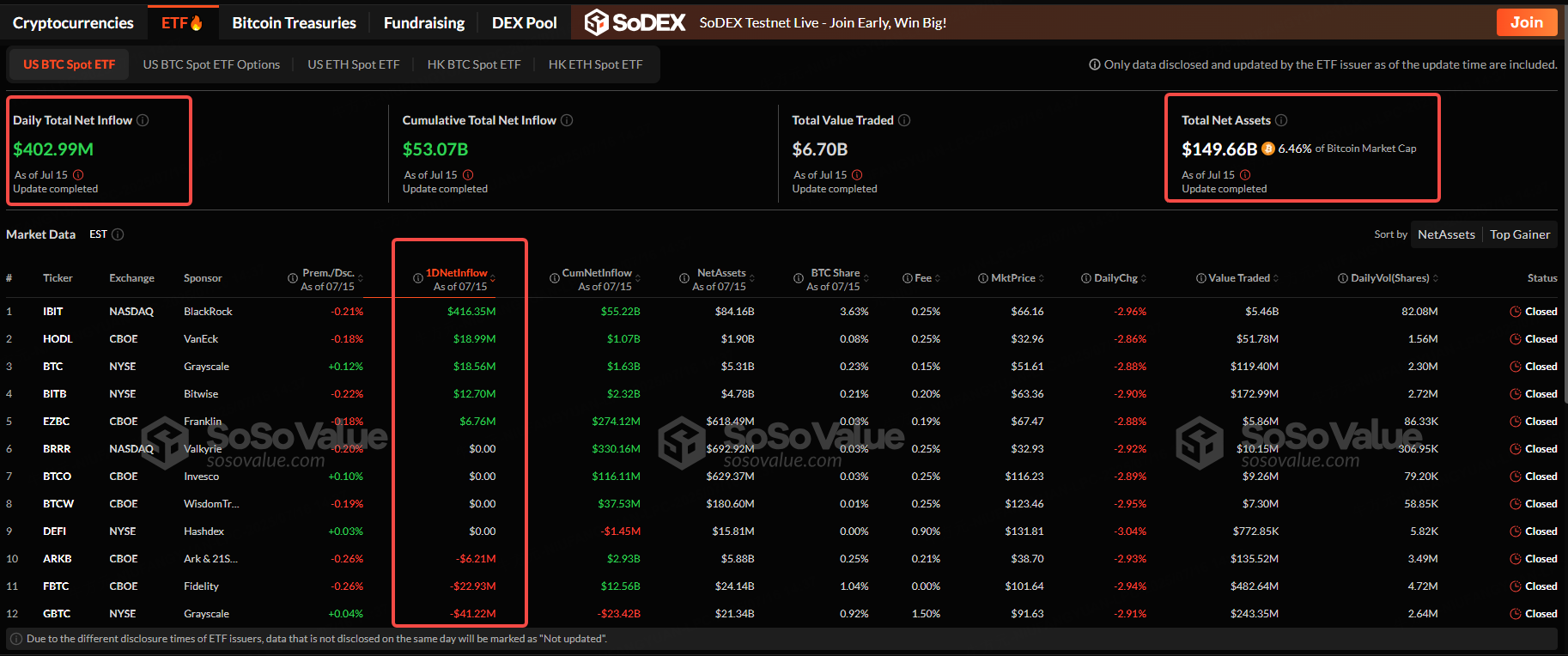 The overall net inflow of the US Bitcoin spot ETF on Tuesday was $402.99 million. The total net asset value of Bitcoin spot ETFs is $149.66 billion, and the ETF net asset ratio (market value compared to total Bitcoin market value) is 6.46%.