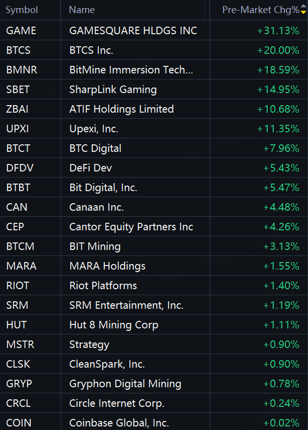 GameSquare rose 31%; BTCS rose 20%; BitMine Immersion rose 19%; SharpLink Gaming rose 15%; Upexi and ATIF Holdings rose 11%; BTC Digital rose 8%; Bit Digital and DeFi Dev rose 5%; Canaan and Cantor Equity Partners rose 4%; BIT Mining rose 3%; MARA Holdings rose 2%; Riot Platforms, SRM Entertainment, Hut 8, Strategy, and CleanSpark rose 1%.