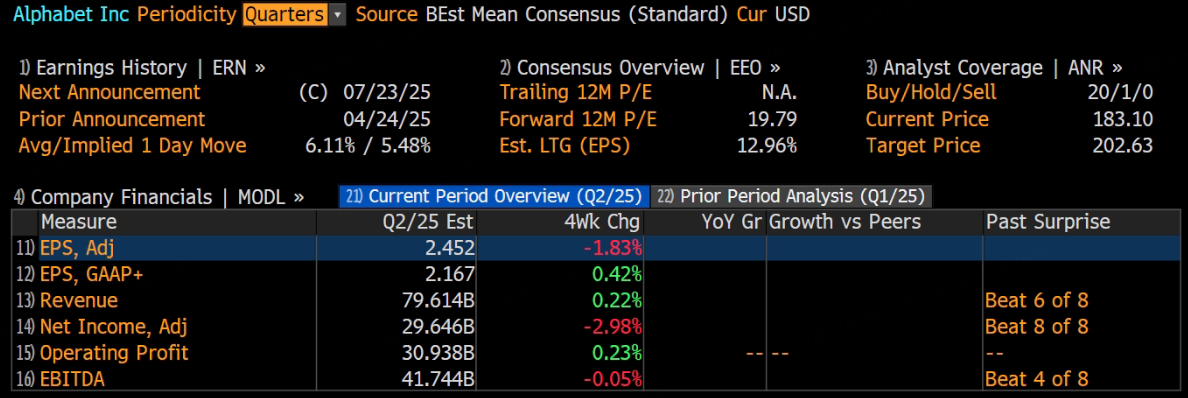 Alphabet's Q2 revenue is expected to be $79.614 billion, adjusted net income will be $29.646 billion, and adjusted EPS is expected to be $2.452, according to Bloomberg's consistent expectations.