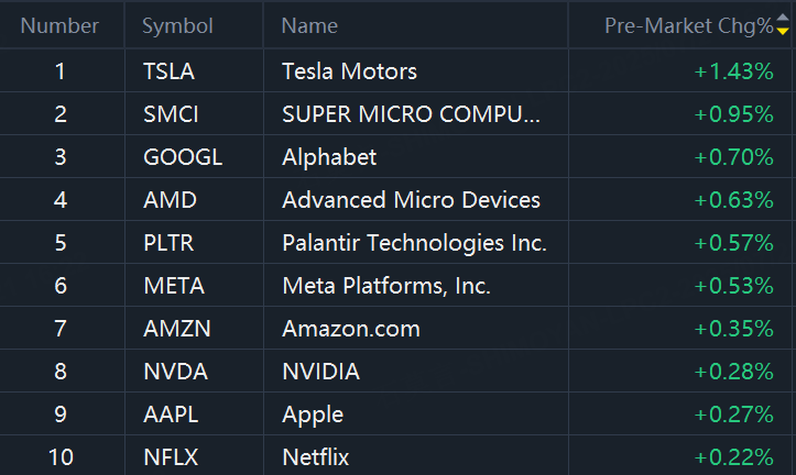 Big techs mostly rose in premarket trading. Tesla rose 1.4%; SMCI up nearly 1%; Alphabet, AMD, Palantir up within 1%.