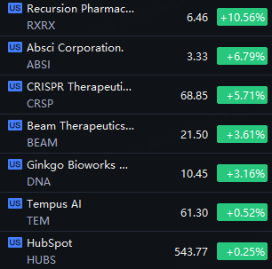 AI Biotech Stocks Shined. Recursion Soared 10%; Absci up 7%; Crispr up 6%; Beam and Ginkgo up 3%.