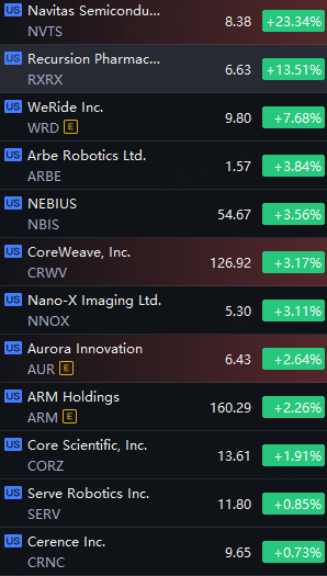 Nvidia-Linked Stocks Rally. Navitas Up 24%; Recursion up 13%; WeRide Up 8%; Arbe, Nebius, CoreWeave, Nano-X And Aurora Up 3%.
