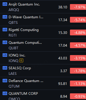 Quantum shares dropped. Arqit down 8%; D-Wave down 6%; Rigetti And Quantum Computing down 4%.