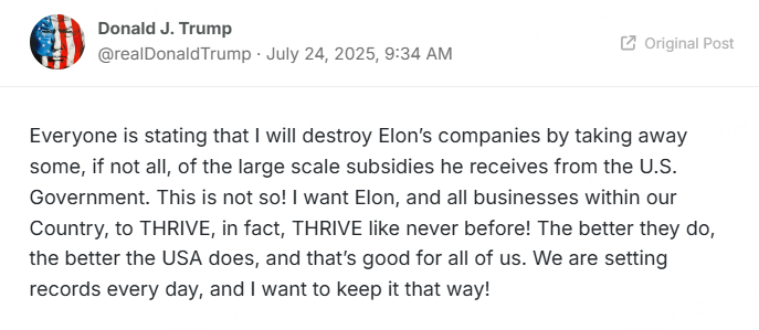 Trump posted on his Truth Social:” Everyone is stating that I will destroy Elon’s companies by taking away some, if not all, of the large scale subsidies he receives from the U.S. Government. This is not so! I want Elon, and all businesses within our Country, to THRIVE, in fact, THRIVE like never before! The better they do, the better the USA does, and that’s good for all of us. We are setting records every day, and I want to keep it that way!”