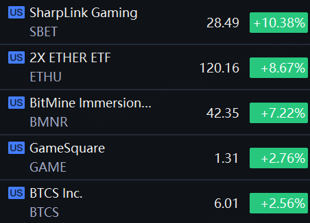 Ether Holding Stocks Rally. SharpLink up 10%; BitMine up 7%; GameSquare and BTCS up 2%.
