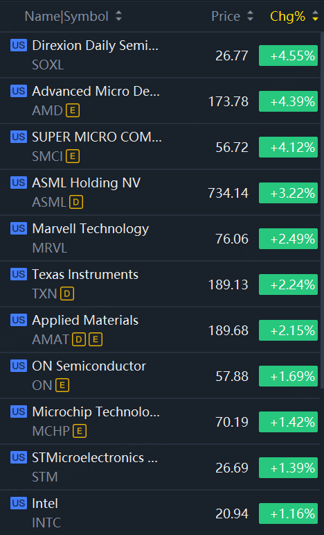 Chip stocks continued to rise on Monday. SOXL, AMD, Super Micro up more than 4%; ASML up 3%; Marvell, Texas Instruments up more than 2%.