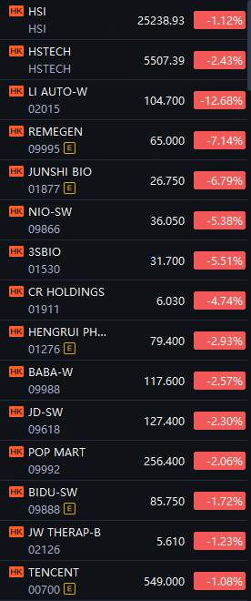 HSI down 1%; HSTECH down 2.4%; Li Auto down 13%; Nio down 5%; Alibaba, JD and Pop Mart down 2%; Tencent down 1%.