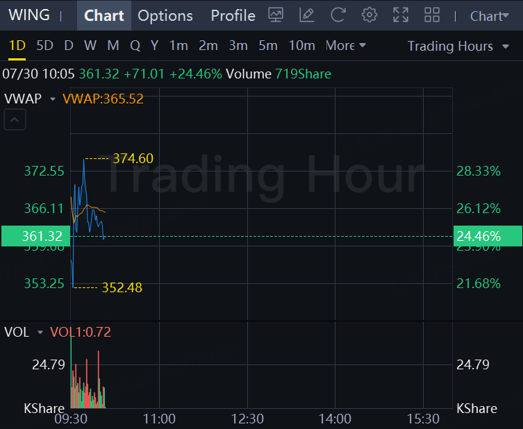 Shares of restaurant chain Wingstop rise 24.46% to $361.32 in premarket trade. Co raised its annual forecast for global unit growth rate range to 17% to 18%, from prior range 16% to 17%.