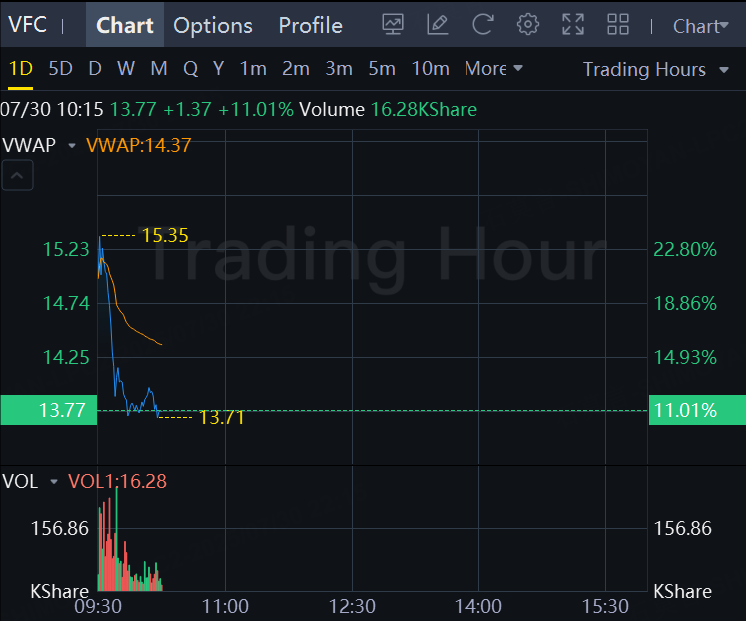 VF Corp beat first-quarter revenue estimates on Wednesday, helped by an uptick in demand for its apparel and footwear products, sending its shares up about 11%.