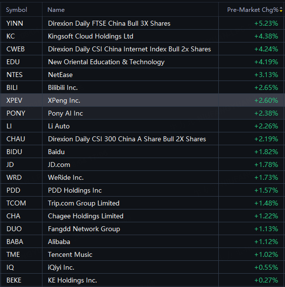 YINN rose 5%; Kingsoft Cloud, CWEB rose 4%; NetEase, XPeng, Bilibili rose 3%; JD.com, Li Auto, PDD rose 2%; Alibaba rose 1%.