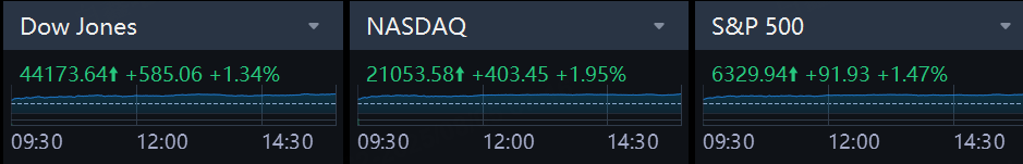 The Dow Jones Industrial Average .DJI rose 585.06 points, or 1.34%, to 44,173.64, the S&P 500 .SPX gained 91.93 points, or 1.47%, at 6,329.94 and the Nasdaq Composite .IXIC climbed 403.45 points, or 1.95%, to 21,053.58.