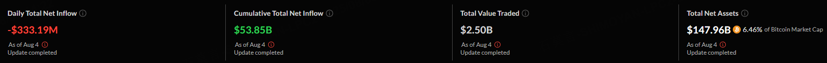 The overall net outflow of the US Bitcoin spot ETF on Monday was $333.19 million. The total net asset value of Bitcoin spot ETFs is $147.96 billion, and the ETF net asset ratio (market value compared to total Bitcoin market value) is 6.46%.