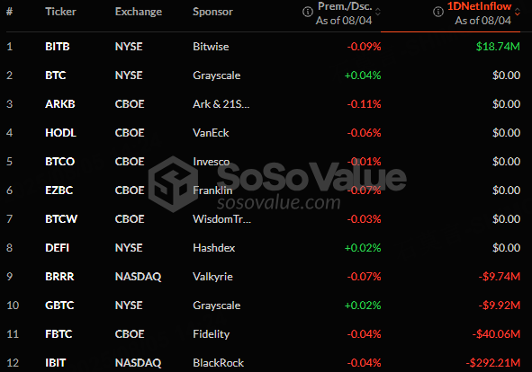 The Bitcoin spot ETF with the highest net inflow on Aug 4 was Bitwise Bitcoin ETF, with a net inflow of $18.74 million. The biggest outflow was iShares Bitcoin Trust ETF, with a net outflow of 292.21 million, according to SoSoValue.