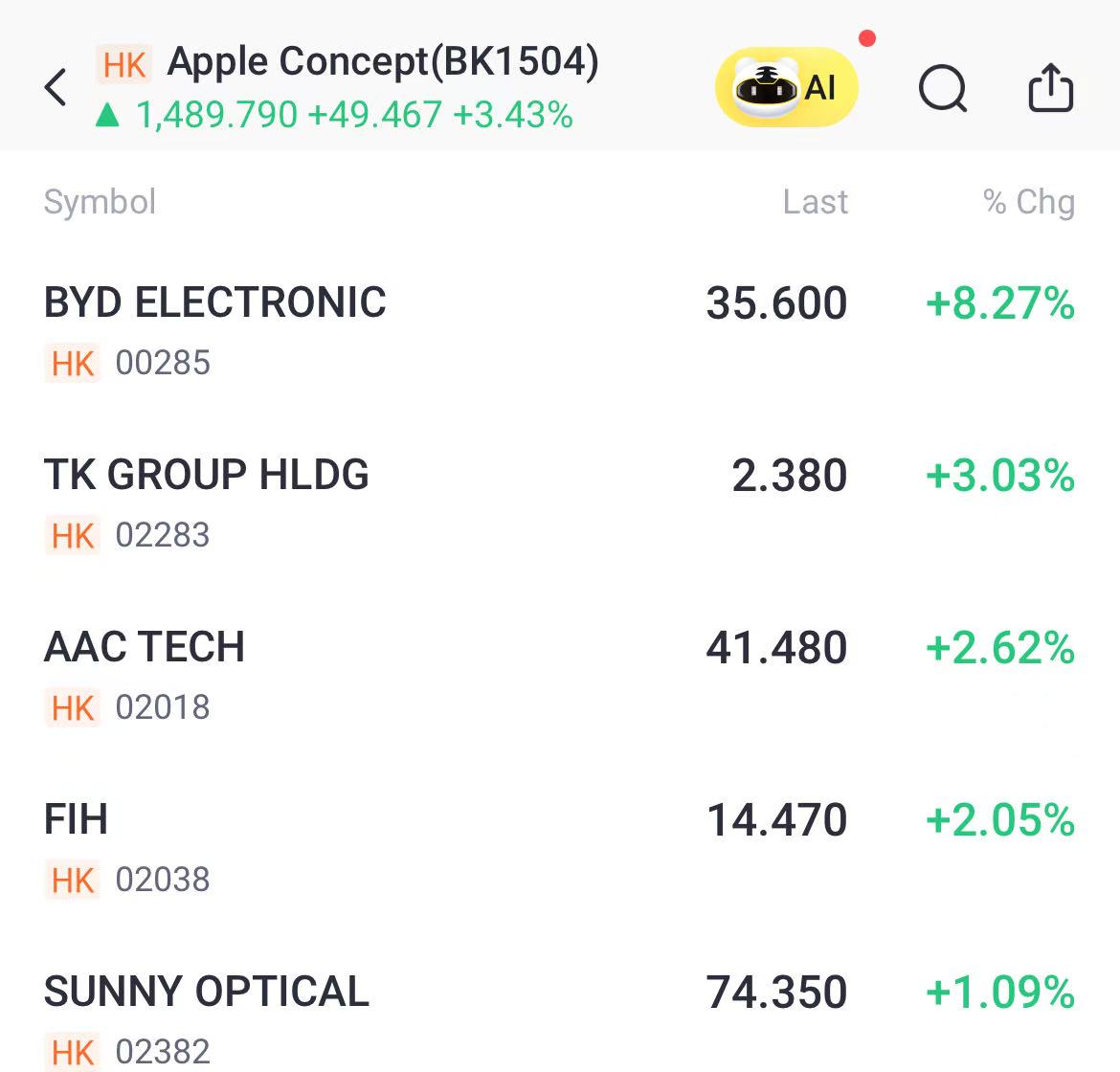 HK Movers | Apple Concept Stocks Jump. BYD Electronic up over 8%; TK Group up 3%; AAC Tech, FIH up over 2%