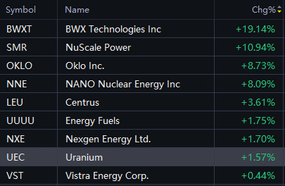 Nuclear stocks rose in Tuesday trading. BWXT up 19%; NuScale Power up 11%; Oklo up 9%; Nano Nuclear up 8%; Centrus up 4%; Energy Fuels up 2%.