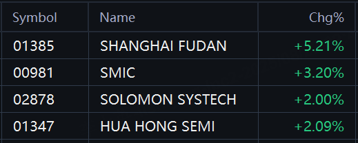 Semiconductor stocks in Hong Kong defied the market trend and rose, with Shanghai Fudan increasing by more than 5%. SMIC jumped 3%. Hua Hong Semiconductor and Solomon Systech rose 2%.