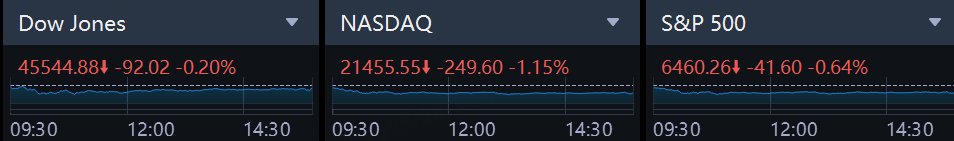 The S&P 500 declined 0.64% to end the session at 6,460.26 points a day after notching a record-high close. The Nasdaq declined 1.15% to 21,455.55 points, while the Dow Jones Industrial Average declined 0.20% to 45,544.88 points.
