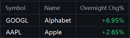 24H | Alphabet Surges 7%; Apple Jumps 3%; NIO and Zscaler Gain 2%; Alibaba Rises 1%; Skillz Sinks 11%