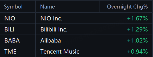 Some Chinese ADRs rose in overnight trading. NIO rose 1.7%; Bilibili rose 1.3%; Alibaba rose 1%; Tencent Music rose 0.9%.