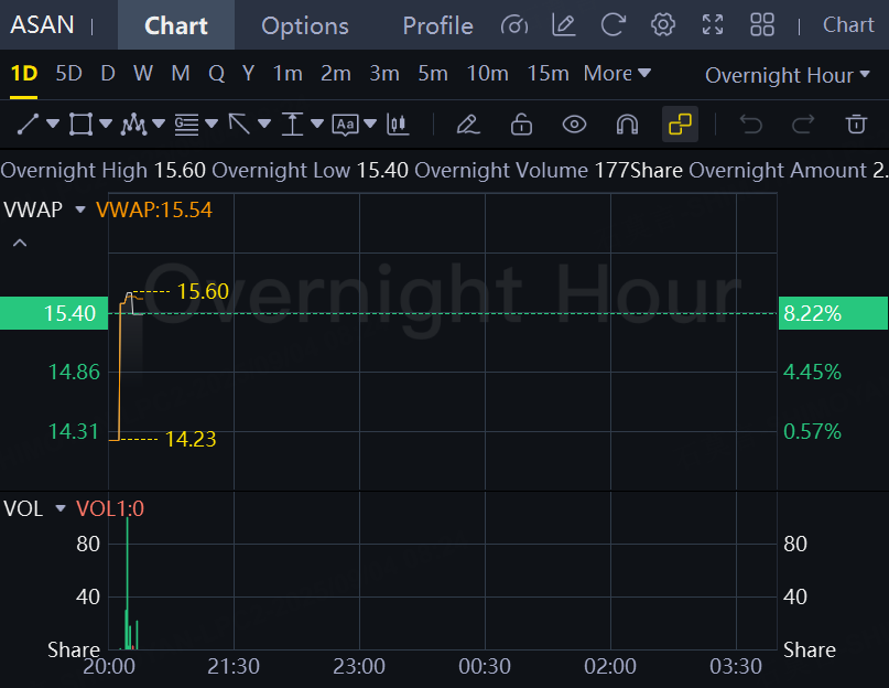 Office-management software firm Asana stock jumped more than 8% in overnight trading after reporting quarterly earnings of six cents per share, which beat the Street estimate of five cents. Quarterly revenue of $196.94 million beat the analyst estimate of $193.01 million and is up from revenue of $179.21 million from the same period last year.