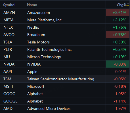 Big tech stocks mixed in Thursday trading. Amazon rose 4%; Meta, Netflix rose 2%; Broadcom up 1%; Tesla up 0.3%; AMD fell 2%; Alphabet fell 1%.