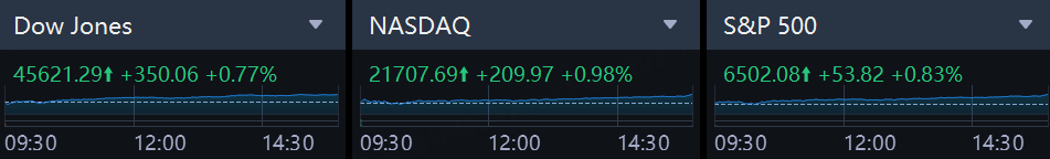 The Dow Jones Industrial Average rose 350.06 points, or 0.77%, to 45,621.29, the S&P 500 rose 53.82 points, or 0.83%, to 6,502.08 and the Nasdaq Composite rose 209.97 points, or 0.98%, to 21,707.69.