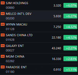 HK Gaming concept stocks shined. SJM Holdings and Melco International rising 6%; Wynn Macau and Sands China up 4%; Galaxy Entertainment and MGM China up 2%; Paradise Entertainment gaining 1%.