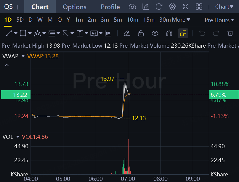 QuantumScape Corporation saw its stock soar 6/8% in pre-market trading on Tuesday, following the announcement of a strategic partnership with Corning Incorporated. The collaboration aims to develop and commercialize ceramic separators for QuantumScape's next-generation solid-state batteries, marking a significant step towards the mass production of this advanced technology.