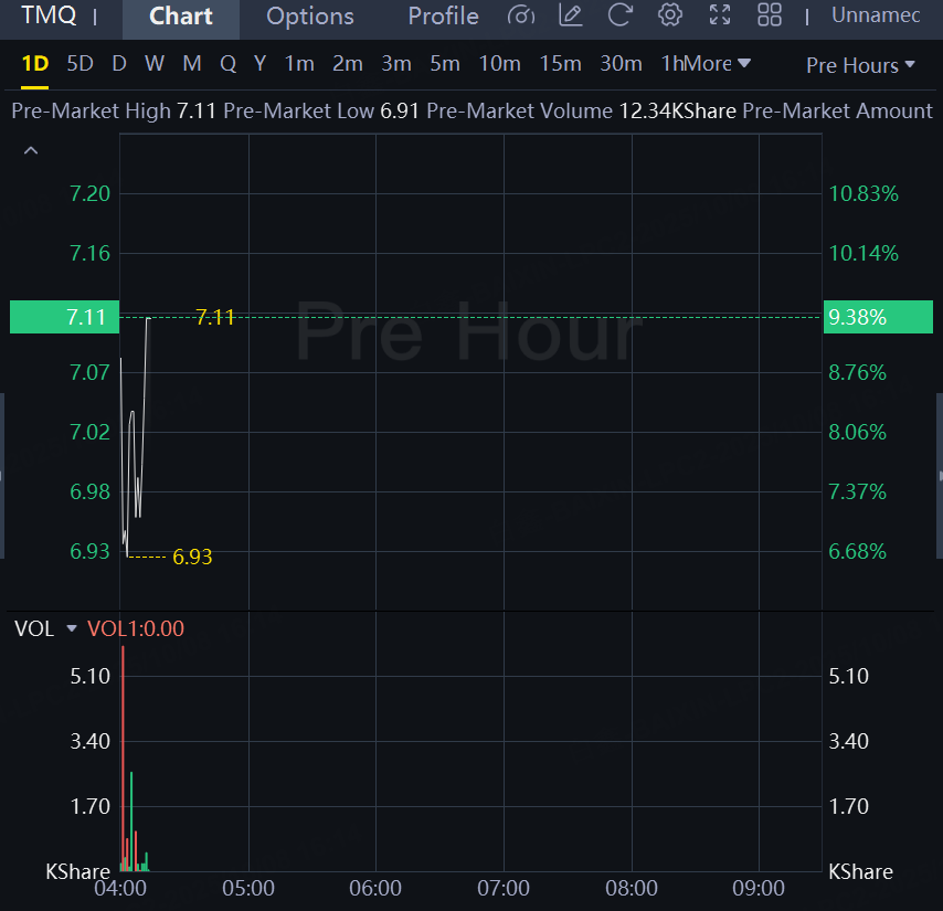 Trilogy Metals gained another 9% in premarket after soaring 211% on Tuesday. The White House said it would acquire a 10% stake in the Vancouver-based miner.