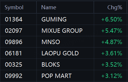 New consumption stocks jumped in Hong Kong. Guming rose 7%; Mixue Group rose 6%; MNSO rose 5%; Laopu Gold and Bloks rose 4%; Pop Mart rose 3%.