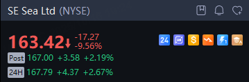 After a strong 2025 rally, Sea Ltd’s stock has been volatile this week. The shares opened Oct. 15 near $184 (after closing $180.69 on Oct. 14) but slumped to a day’s low of about $162, settling at $163.42. This ~10% one-day drop wiped out weeks of gains, in line with a broader tech selloff. Trading volume on Oct. 15 (~9.16 million shares) far exceeded recent averages. Over the past 52 weeks, SE stock traded between $92.50 and $199.30, so even after this pullback the shares remain well above early-year lows.