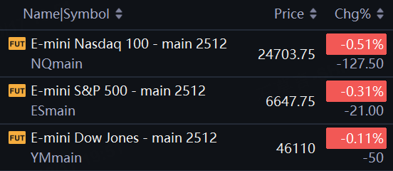 At 7:50 a.m. ET, Dow e-minis were down 50 points, or 0.11%, S&P 500 E-minis were down 21 points, or 0.31%, and Nasdaq 100 E-minis were down 127.5 points, or 0.51%.