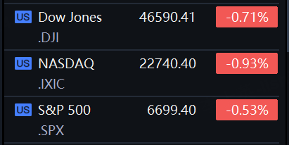 The Dow Jones Industrial Average fell 334.33 points, or 0.71%, to 46,590.41, the S&P 500 lost 35.95 points, or 0.53%, to 6,699.40 and the Nasdaq Composite lost 213.27 points, or 0.93%, to 22,740.40.