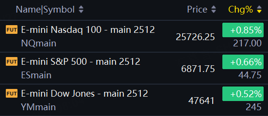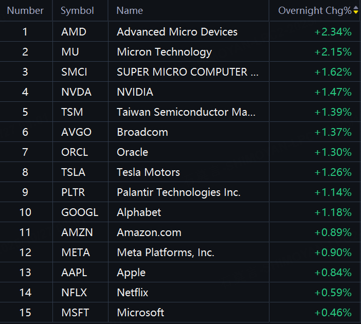 Big tech stocks jumped in overnight trading. AMD, Micron up over 2%; Super Micro, Nvidia, TSMC, Broadcom, Oracle, Tesla up over 1%.