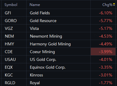 Gold stocks fell in Monday trading as spot gold fell 2.3% to $4,018/Oz. Gold Fields, Gold Resources fell 6%; Newmont fell 5%; Harmony Gold, U.S. Gold, Coeur Mining fell 4%.
