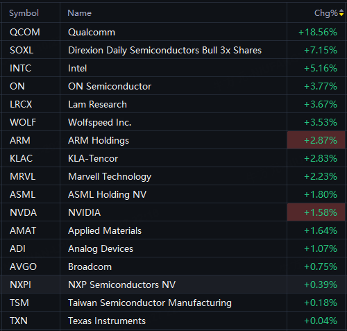 Semiconductor shares rose in Monday trading. Qualcomm up 19%; SOXL rose 7%; Intel up 5%; ON Semiconductor up 4%; Arm up 3%; Nvidia up 2%; Broadcom up 1%.